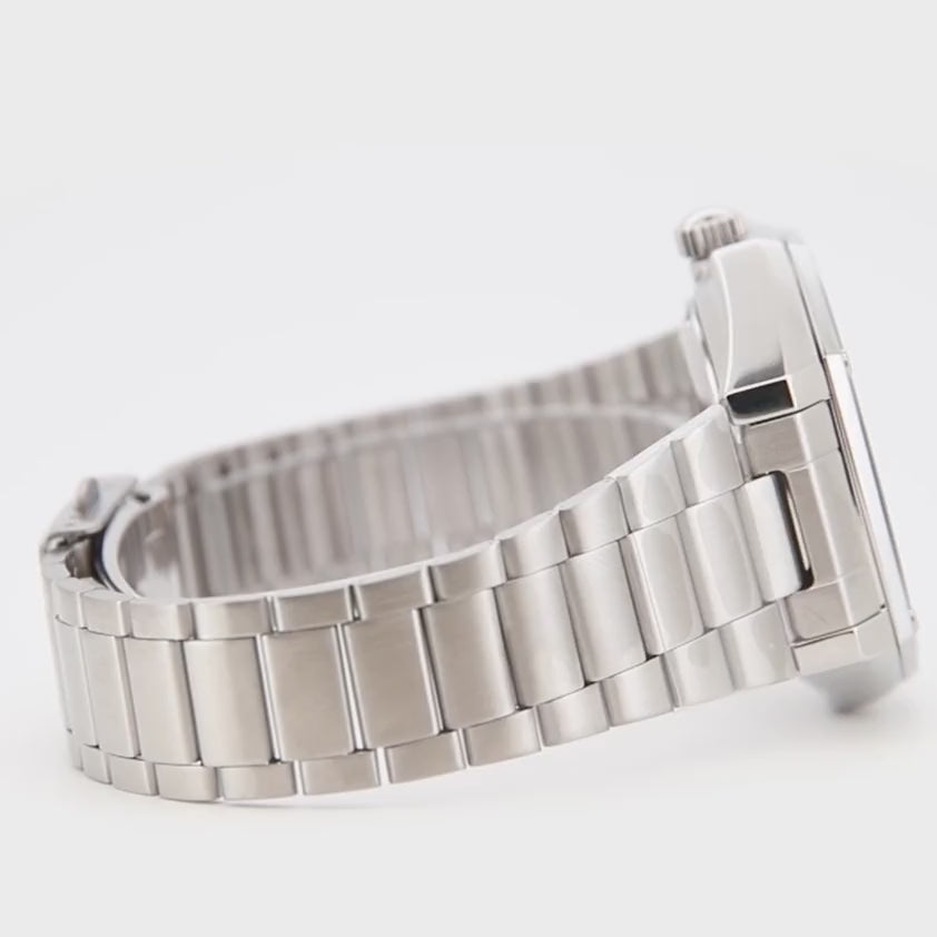 Cadran champagne à finition uniforme évoquant les palettes Seventies, index appliqués fins et aiguilles assorties sous verre minéral, la minuterie périphérique maintient l’ordre visuel et facilite une lecture claire. Le boîtier en acier privilégie des lignes épurées et un fond transparent qui suggère la construction interne sans en détourner l’attention, tandis que le bracelet couleur argent prolonge la continuité matérielle. Il en résulte un ensemble essentiel et élégant, bien proportionné, capable d’évoluer naturellement entre formel et décontracté.