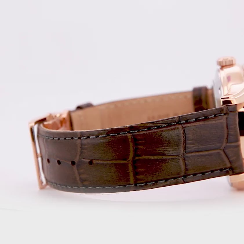 Cadran marron chocolat aux reflets maîtrisés, index appliqués et aiguilles assorties assurent une lecture nette, l’indicateur Soleil & Lune ajoute une profondeur chromatique, tandis que le jour et la date équilibrent la composition. Le verre saphir protège un mécanisme soigné, le boîtier en acier dialogue avec les tons chauds du cadran, le bracelet en cuir marron assure la continuité. Style affirmé mais mesuré, avec une présence sobre et un langage graphique clair, conçu pour durer.