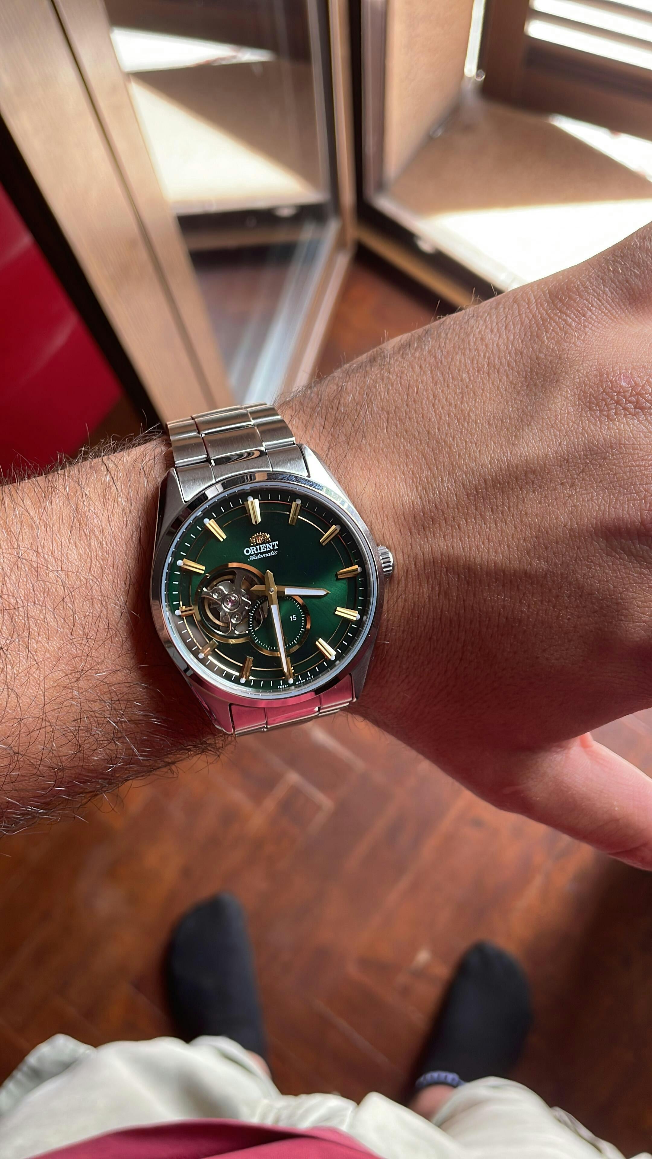 Cadran avec âme visible et petite seconde en dialogue : la fenêtre semi-squelette se superpose au compteur créant profondeur et rythme. Boîtier au trait affirmé et graphisme ordonné privilégient la lisibilité, tandis que les finitions radiales et la palette allant du blanc au bleu clair, au vert et au rouge modernisent l’esthétique. Le fond transparent dévoile le mouvement de manufacture. Le bracelet en acier complète un équilibre entre caractère technique et élégance quotidienne.