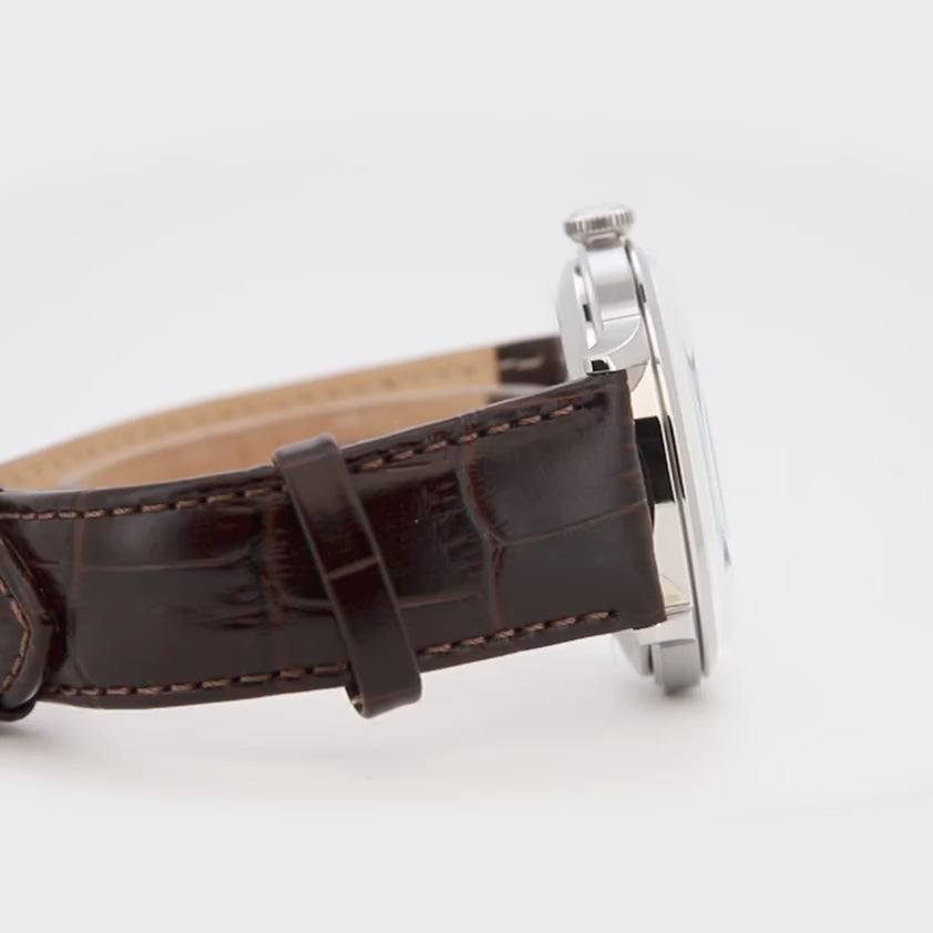 Petite seconde comme signature esthétique, avec un compteur dédié qui allège le cadran et introduit un rythme continu. La structure reste classique : verre bombé, cadran légèrement incurvé et graphisme ordonné avec chiffres arabes alternant avec des index en bâtons. Une fenêtre de date s’intègre discrètement, tandis que les finitions radiales et les variantes plaquées alternent avec des tons neutres et foncés. Des bracelets en cuir à motif crocodile complètent un caractère formel actualisé dans les détails.