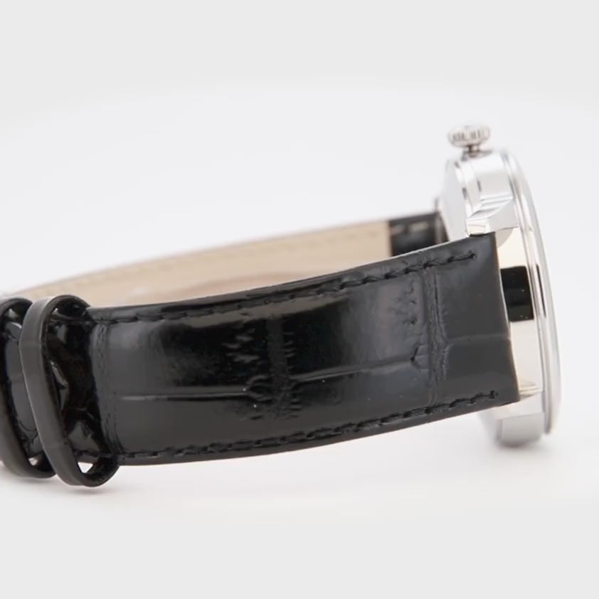 Quadrante nero con apertura sul bilanciere e grafica ordinata, indici applicati e lancette coordinate sotto vetro bombato organizzano un contrasto leggibile, la minuteria perimetrale scandisce i passaggi con precisione. La cassa in acciaio, accompagnata da fondello a vista, privilegia superfici pulite, il cinturino in pelle nera rafforza l’identità cromatica. L’insieme combina ordine formale e richiamo tecnico, mantenendo un equilibrio sobrio, coerente e privo di eccessi.