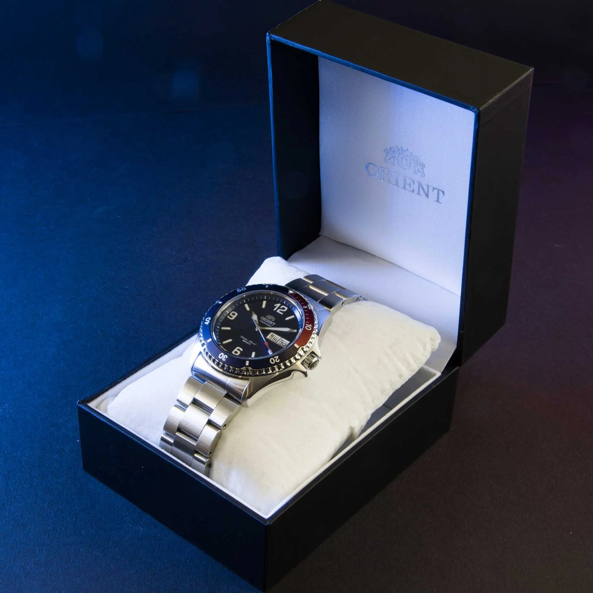 Quadrante blu con indici applicati e lancette ben sagomate, incorniciato da una lunetta bicolore che richiama l’estetica classica dei diver. La grafica del capitolo minuti è nitida, il datario mantiene l’uso quotidiano semplice e immediato. Corona e fondello a vite sostengono la robustezza complessiva, mentre il bracciale in acciaio con chiusura di sicurezza garantisce continuità visiva con la cassa. Un equilibrio tra tradizione sportiva e versatilità urbana.