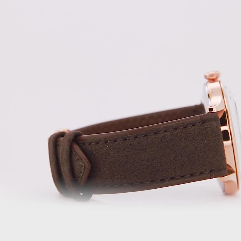Quadrante bronzo a raggiera dai riflessi caldi, indici applicati e lancette coordinate sotto vetro bombato, datario a ore 3 ben leggibile e grafica ordinata lungo il perimetro. La cassa in acciaio con fondello trasparente mostra una costruzione curata, mentre il cinturino in pelle marrone, uniforme su tutti i lati, rafforza la palette. Ne nasce un profilo sobrio e preciso, con presenza chiara e una continuità cromatica che valorizza la tinta del quadrante.