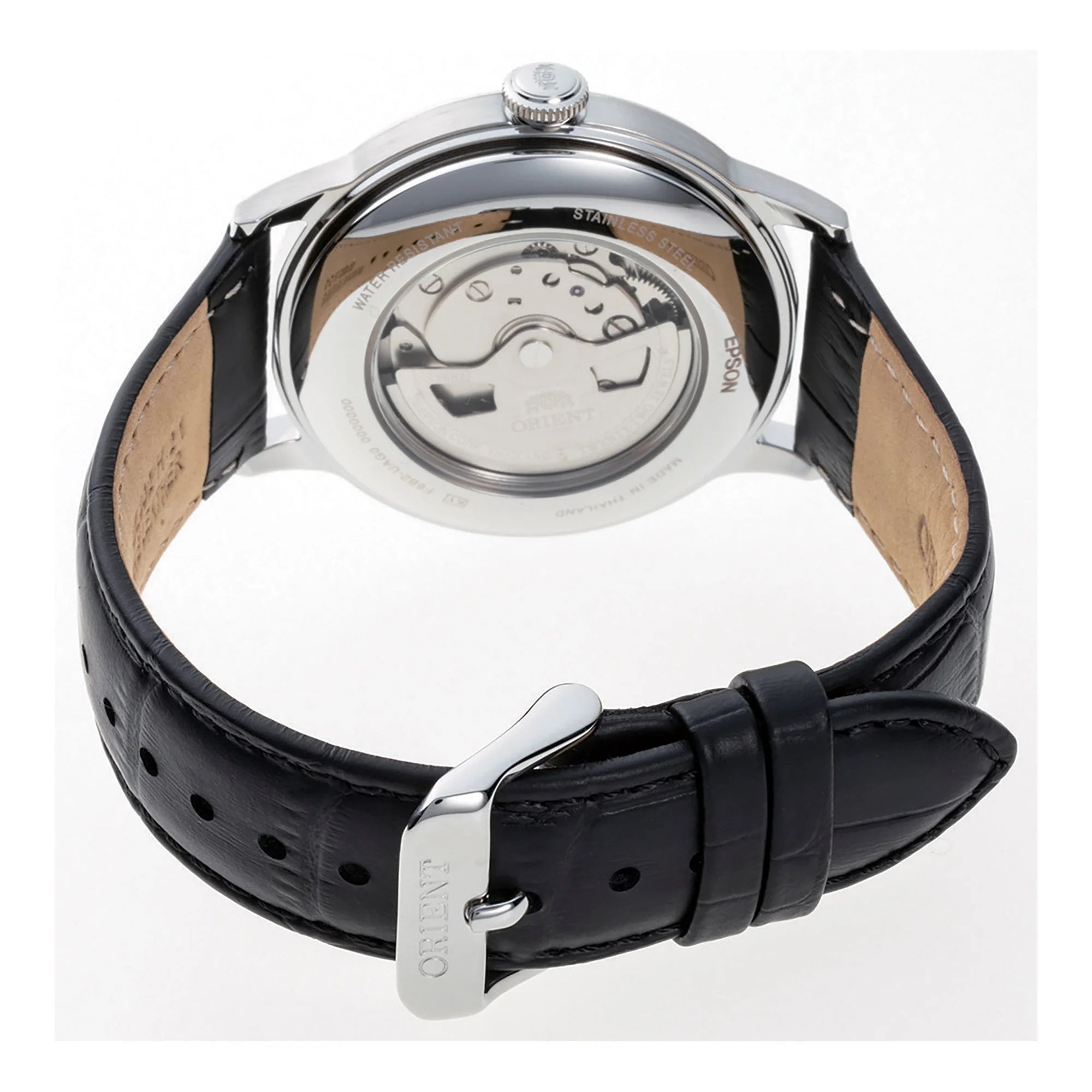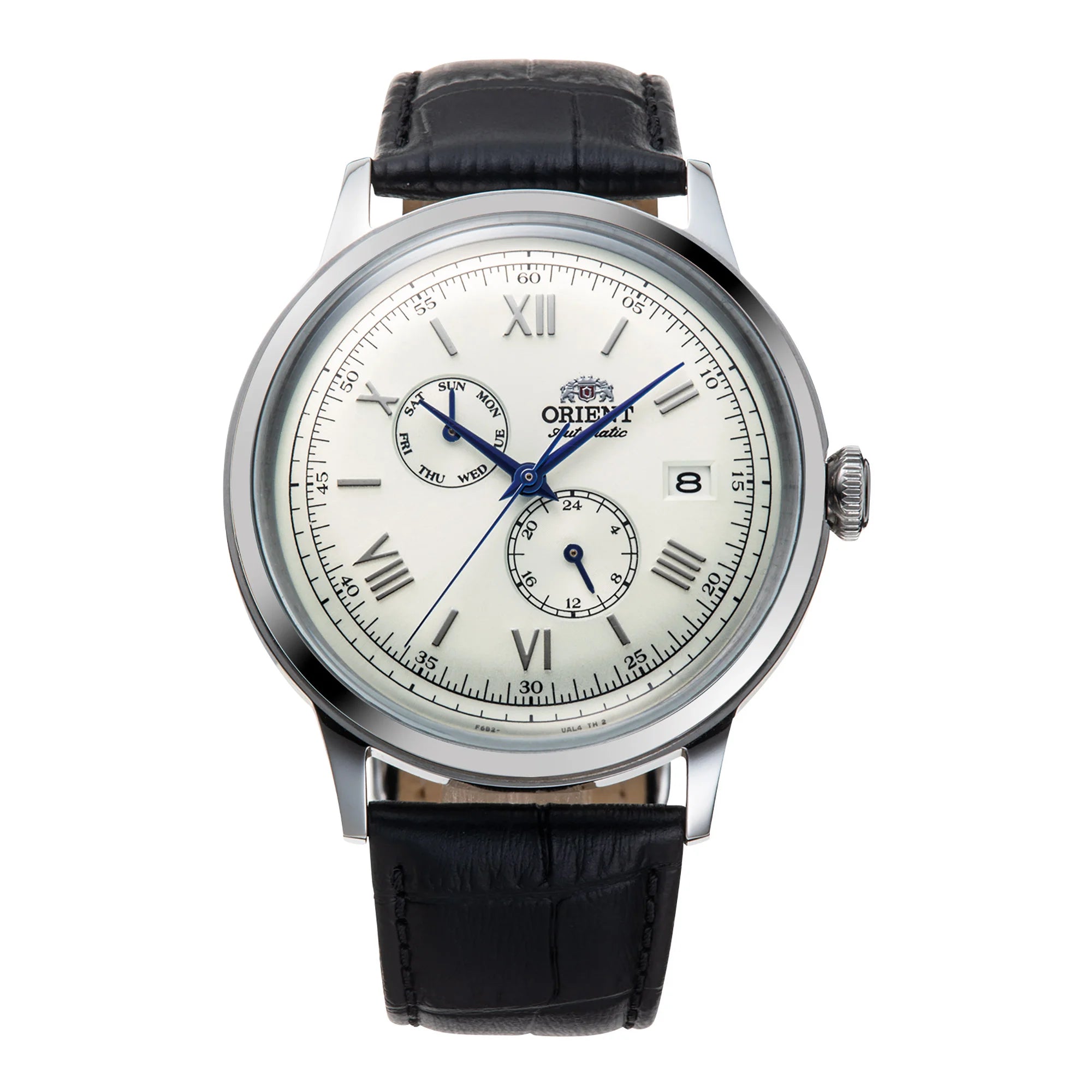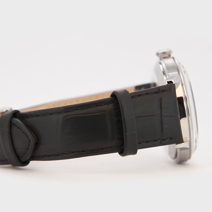 Quadrante classico con contatori dedicati a giorno, data e indicazione delle ore su ventiquattro che ne definiscono l’identità. Vetro bombato e quadrante leggermente curvo richiamano i segnatempo da abito, mentre indici applicati e sfere affusolate mantengono una lettura pulita. Le palette alternano bianco e avorio con sfere blu a varianti grigie e bordeaux dai contrasti caldi. Il fondello a vista valorizza il movimento meccanico, tra tradizione e funzionalità quotidiana.