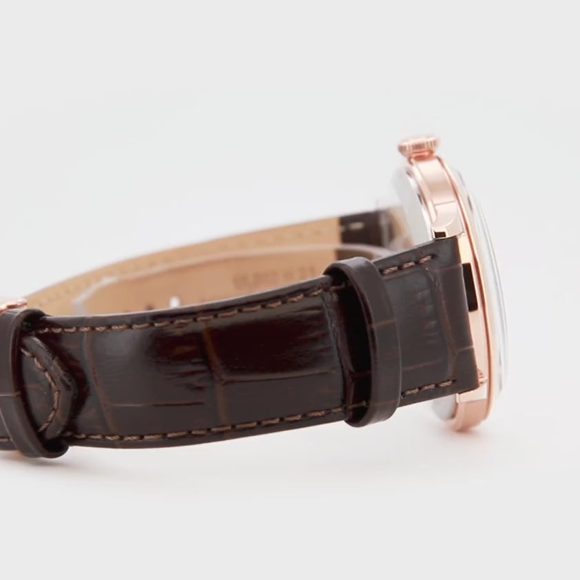 Quadrante chiaro a finitura radiale con finestra “open heart” che lascia intravedere il bilanciere, fulcro estetico della composizione. Indici applicati e sfere a taglio netto valorizzano i riflessi del vetro bombato, mentre la minuteria a chemin de fer aggiunge un riferimento classico. La cassa alterna superfici lucide e satinate con passaggi morbidi sulle anse. Cinturino in pelle dalla grana fine per un insieme elegante e misurato, pensato per accompagnare abiti formali e look quotidiani curati.