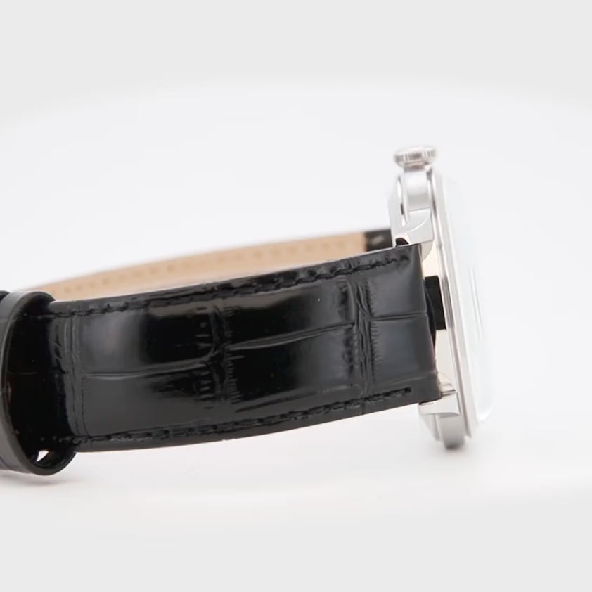 Quadrante nero con cifra romana a ore 12, indici applicati e lancette coordinate sotto vetro bombato, datario a ore 3 inserito con discrezione. La cassa in acciaio con fondello a vista esibisce una costruzione curata, mentre il cinturino in pelle nera rafforza il contrasto. Un profilo formale dal tono deciso, con dettagli classici ben definiti e una presenza controllata che non rinuncia alla comodità d’uso.