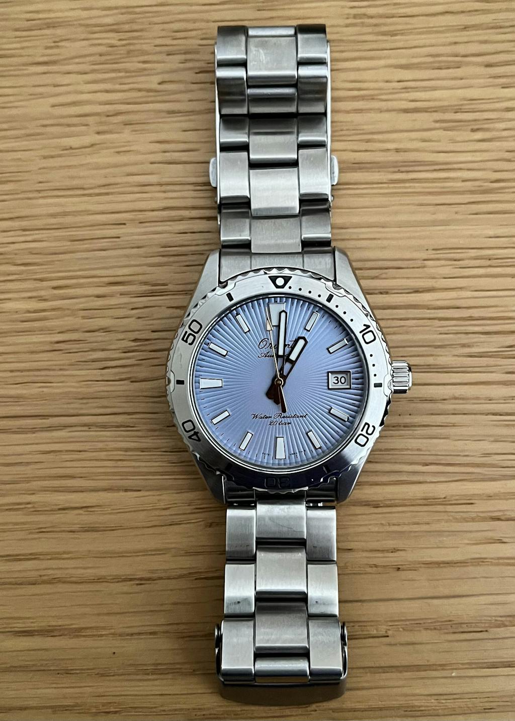 Ein Taucheruhr mit kompakter und klarer Gestaltung: eine metallene Lünette mit Markierungen, ein Zifferblatt in Vollfarbe und eine geordnete Grafik fördern Lesbarkeit und Ausgewogenheit. Aufgesetzte Indizes und Zeiger mit Leuchtmasse gewährleisten Klarheit in jeder Situation, während die Wahl zwischen einem Stahlarmband und geprägten Silikonbändern die Gebrauchstauglichkeit erhöht. Die Kollektion umfasst eine 75. Jubiläumsausgabe mit festlichen Details: ein kunstvoll gestaltetes Zifferblatt, das historische kursiv geschriebene Logo, ein gravierter Gehäuseboden und eine spezielle Schachtel.