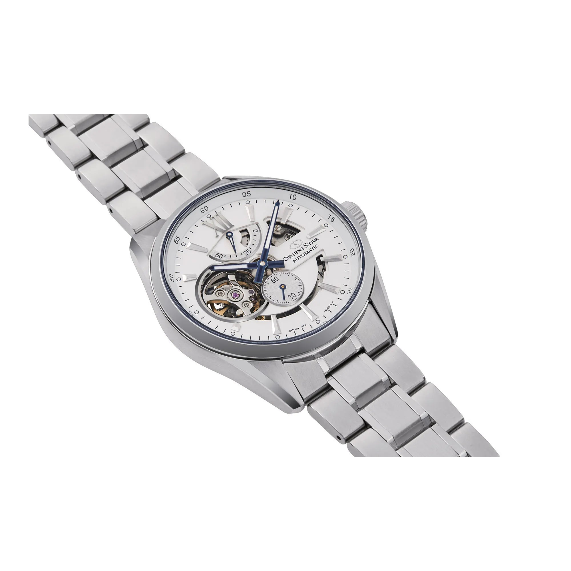 Skelettierung als unverwechselbares Merkmal: sichtbare Brücken und ein beweglicher Unruhreif schaffen eine dynamische Szenerie. Aufgesetzte Stundenmarkierungen und klar gezeichnete Zeiger bewahren Ordnung und Lesbarkeit, während die umlaufende Minuterie den Blick durch die verschiedenen Ebenen des Zifferblatts lenkt. Abwechselnde Oberflächenbearbeitungen und strahlenförmige Verzierungen verstärken das Spiel mit dem Licht. Saphirglas und ein transparenter Gehäuseboden unterstreichen die sorgfältige Verarbeitung. Armband aus Stahl oder Lederbänder, je nach Ausführung. Gleichgewicht zwischen gezeigter Technik und alltäglicher Eleganz.