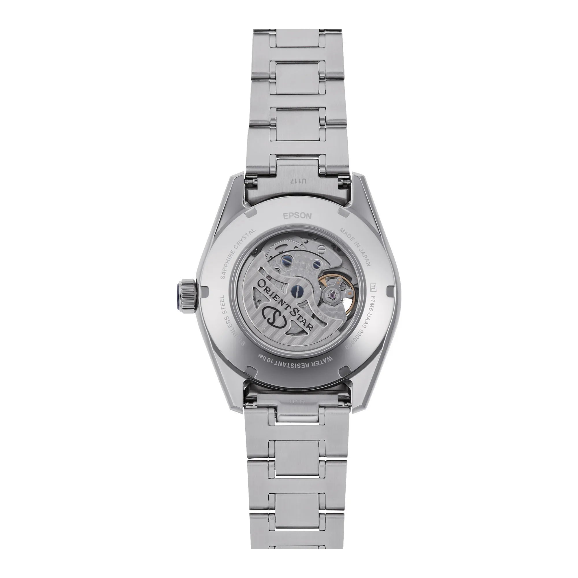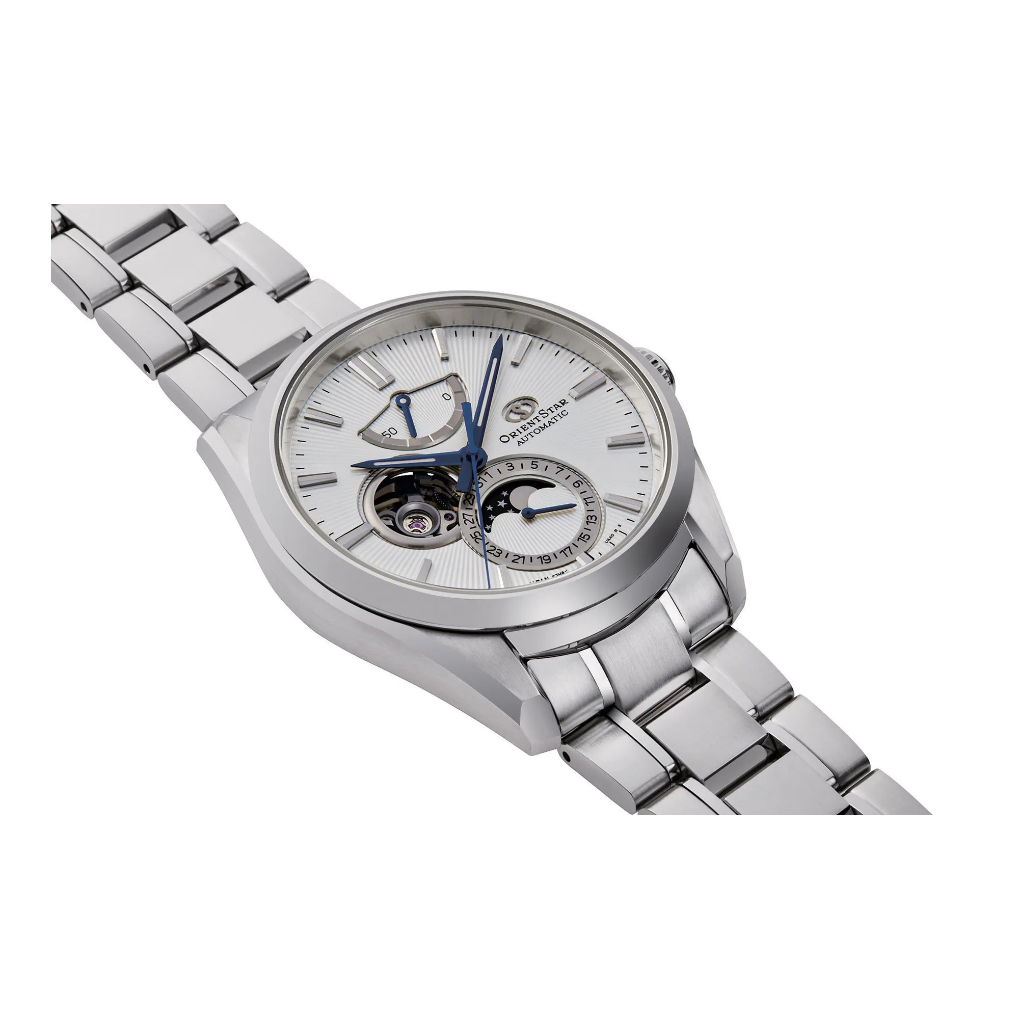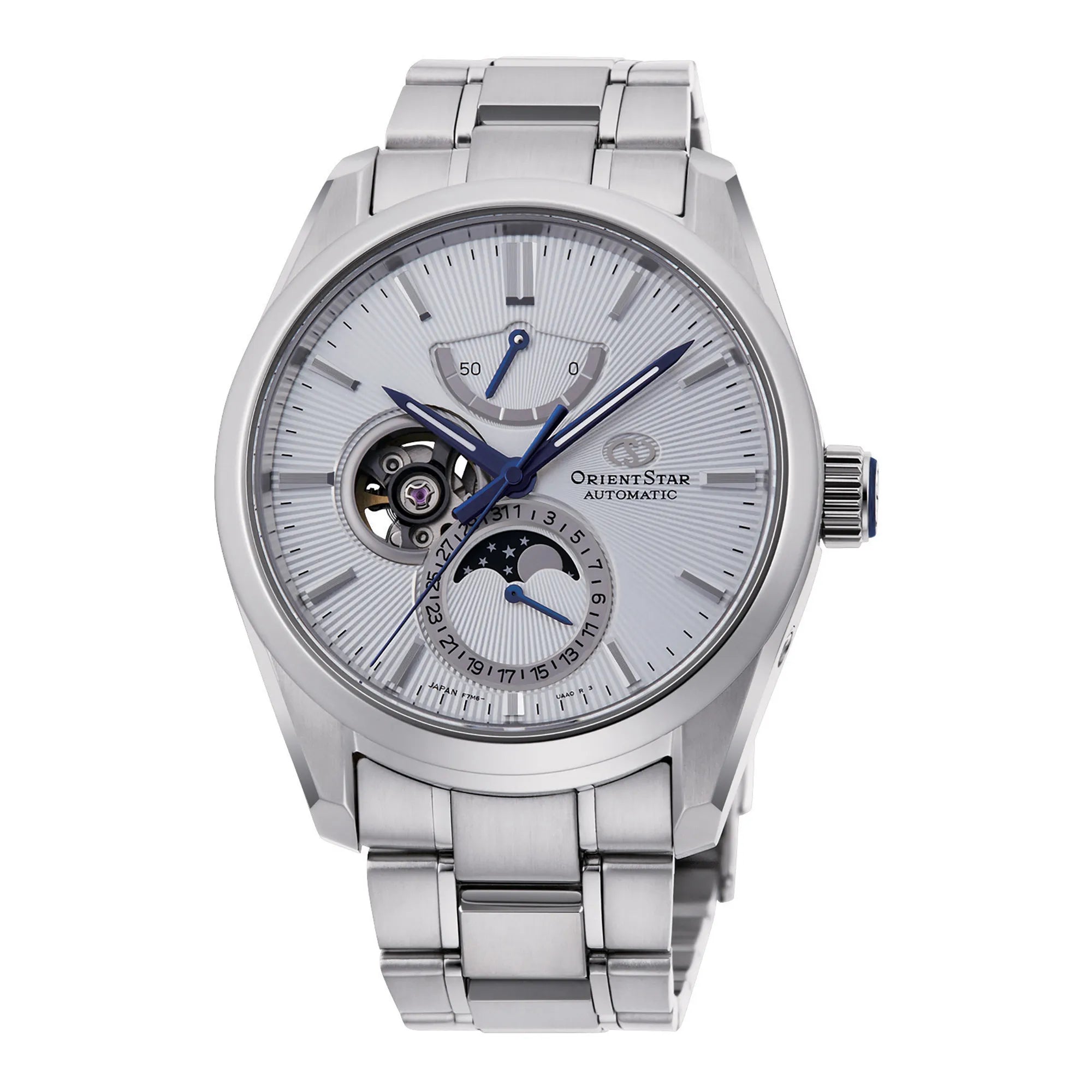 Entdecken Sie die exklusive ORIENT STAR Contemporary Kollektion, in der Eleganz auf Präzision trifft. Diese automatische Herrenuhr mit klassischem und zeitlosem Charme ist ein Meisterwerk japanischer Uhrmacherkunst, gewidmet denen, die Feinheit und Funktionalität schätzen. Das pulsierende Herzstück dieser Uhr ist das mechanische ORIENT F7M63 Werk, ein Manufakturkaliber mit 22 Rubinsteinen. Es bietet sowohl automatisches als auch manuelles Aufziehen und gewährleistet eine beachtliche Gangreserve, die elegant auf dem Zifferblatt angezeigt wird. Ihre Genauigkeit ist mit einer täglichen Abweichung von +25/-15 Sekunden zertifiziert. Ausgestattet mit der Sekundenstoppfunktion ermöglicht sie eine präzise Zeiteinstellung. Neben der Anzeige mit drei Zeigern zeichnet sich die Mondphasen-Uhr durch ihre anspruchsvollen Komplikationen aus: das Datum und die faszinierende Mondphasenanzeige, die dem Design eine poetische Note verleiht. Das runde, robuste und edle Gehäuse besteht aus Edelstahl, hat einen Durchmesser von 41 mm und eine Höhe von 14 mm. Der verschraubte Sichtboden bietet einen atemberaubenden Blick auf das Innenleben. Die Widerstandsfähigkeit wird durch ein Saphirglas gewährleistet, das für seine außergewöhnliche Härte und Kratzfestigkeit bekannt ist, sowie durch eine Wasserdichtigkeit bis 100 Meter (WR 100 m), was sie für den täglichen Gebrauch und leichte Tauchgänge geeignet macht. Die Druckkrone sorgt für eine einfache Bedienung. Die leuchtenden Zeiger garantieren eine hervorragende Ablesbarkeit unter allen Lichtverhältnissen. Die Faltschließe mit Sicherheitsdrücker bietet einen bequemen und sicheren Sitz und vervollständigt ein auf Langlebigkeit ausgelegtes Design. Der 21 mm breite Anstoß und die Standardarmbandlänge von 19 cm passen sich perfekt dem Handgelenk an. Diese Uhr ist ideal für den Mann, der ein markantes Accessoire sucht, das Zuverlässigkeit, klassisches Aussehen und die begehrtesten uhrmacherischen Funktionen vereint. Sie wird mit Bedienungsanleitung und 2-jähriger internationaler ORIENT STAR Garantie geliefert.