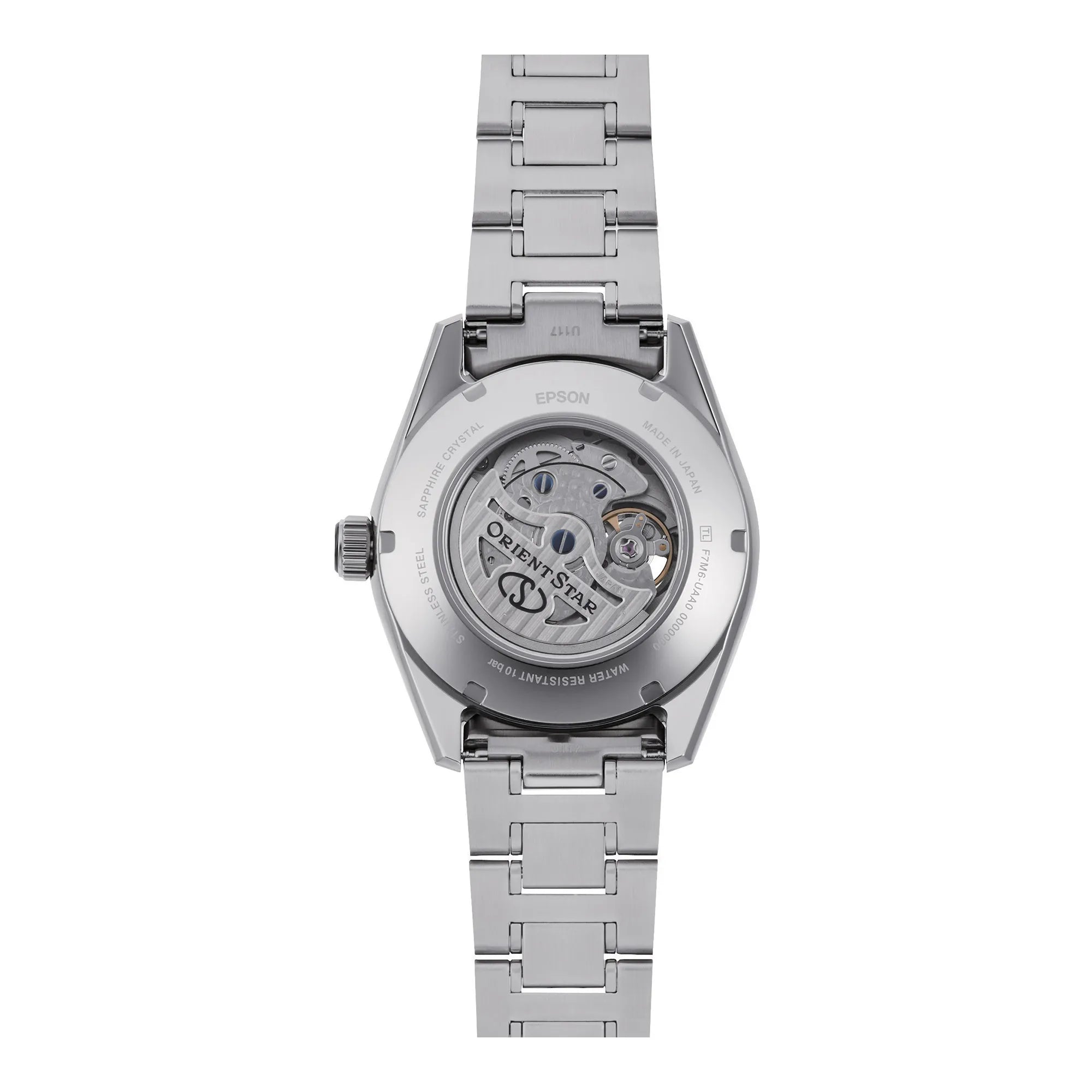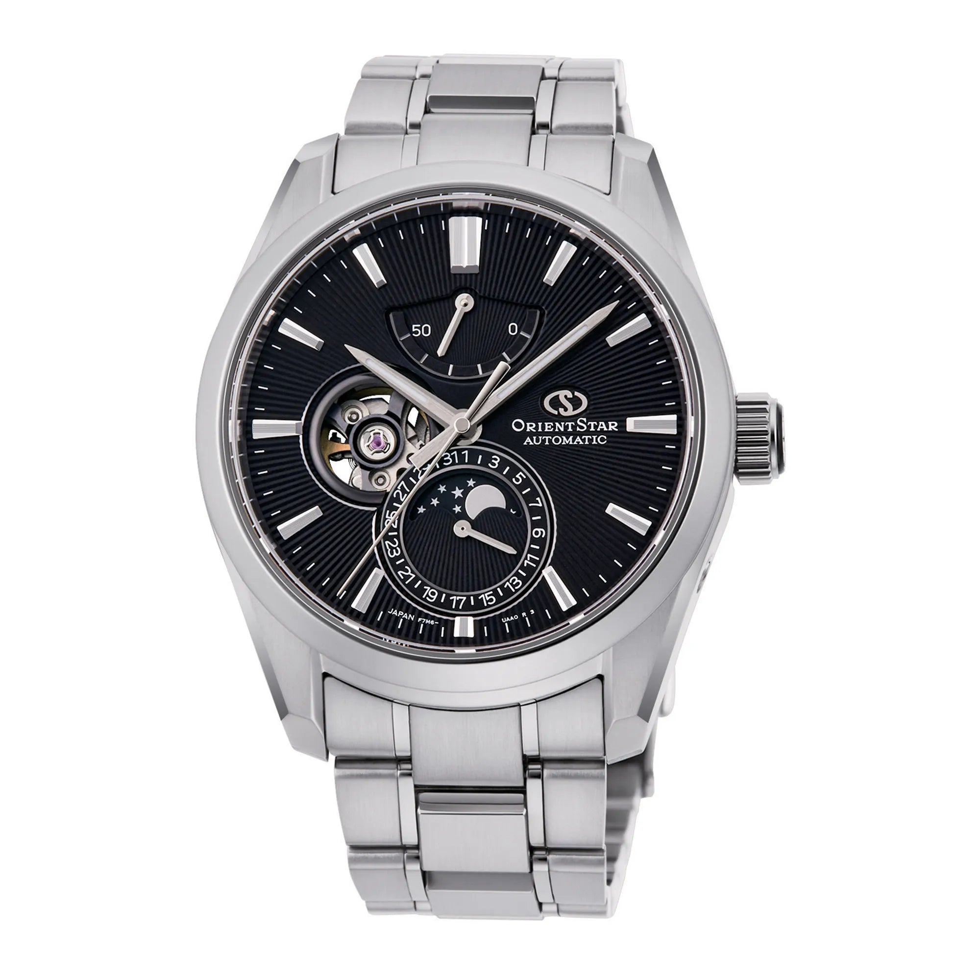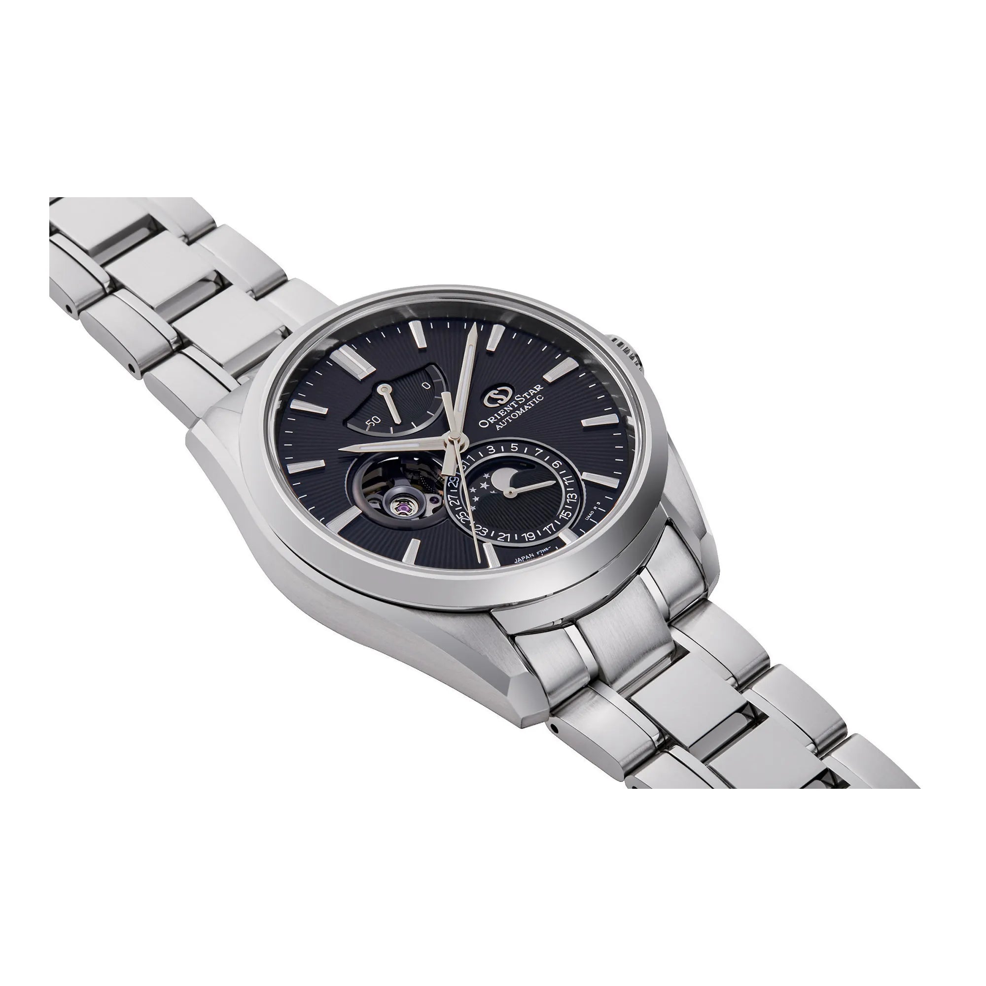 Das neue Meisterwerk ORIENT STAR Contemporary aus der traditionsreichen Moon Phase-Serie, dem ikonischsten und bekanntesten Aushängeschild. Eine Uhr, die zugleich praktisch und anspruchsvoll ist, mit einem halb offenen Sichtfenster auf das Uhrwerk bei 9 Uhr, einer Gangreserveanzeige bei 12 Uhr und einer Anzeige der Mondphasen bei 6 Uhr.
