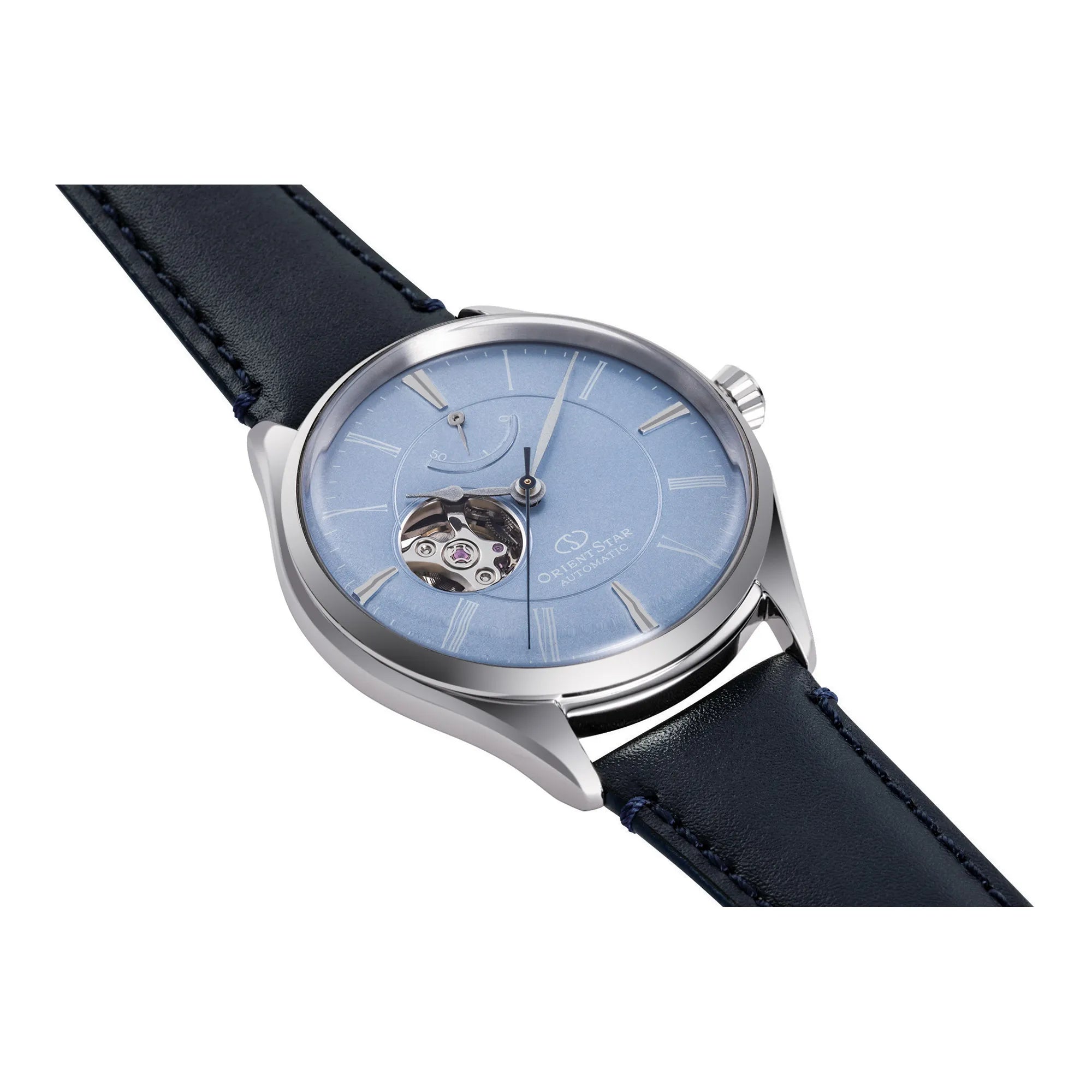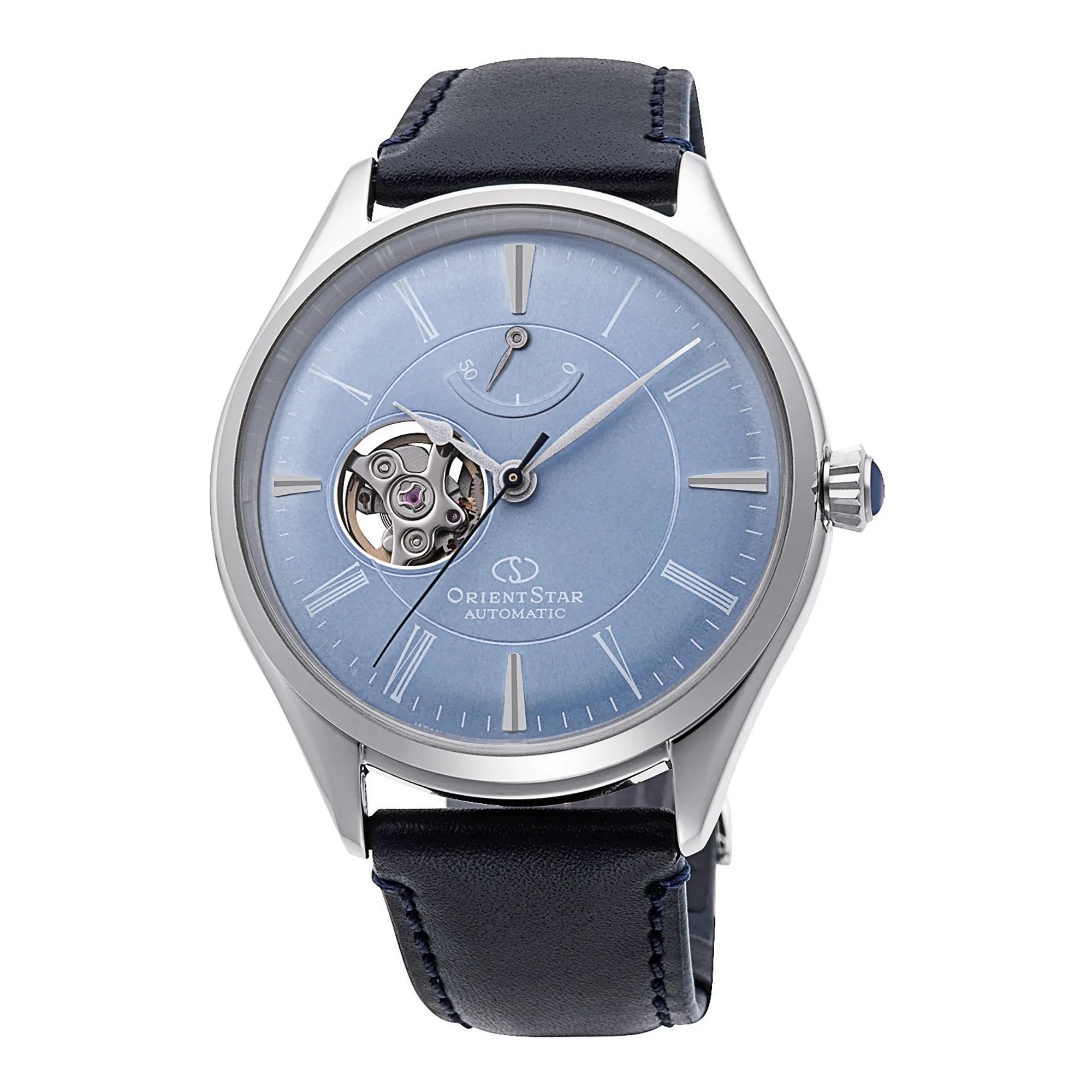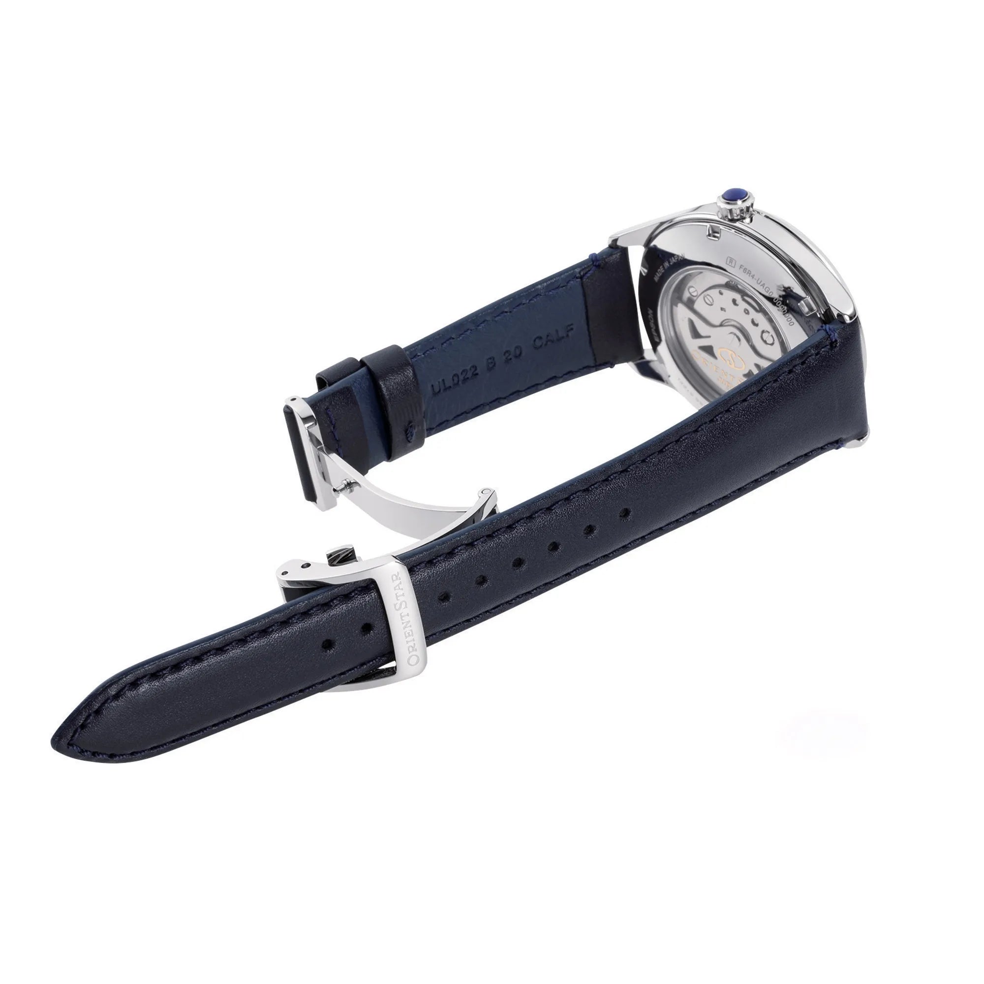 Ein neues Design mit frischem und modernem Aussehen für die Serie Semi Skeleton Netto von ORIENT STAR – gewölbte Zifferblätter in sanften und beruhigenden Farbtönen, inspiriert von natürlichen Farben. Ideal, auch dank ihres wettbewerbsfähigen Preises, als erste mechanische Uhr für eine junge Frau oder einen jungen Mann, mit der Möglichkeit, sie als Paar zu kombinieren. Die Öffnung bei 9 Uhr erlaubt einen Blick auf das hohe Maß an Raffinesse mechanischer Uhren. Der Stein, der die Krone bedeckt, verleiht einen Hauch von Eleganz, ebenso wie das gewölbte Glas, die französischen Nähte des Armbands und die spitz zulaufenden Zeiger. Hier in Herrenversion mit Gangreserveanzeige, blauem Armband und himmelblauem Zifferblatt.