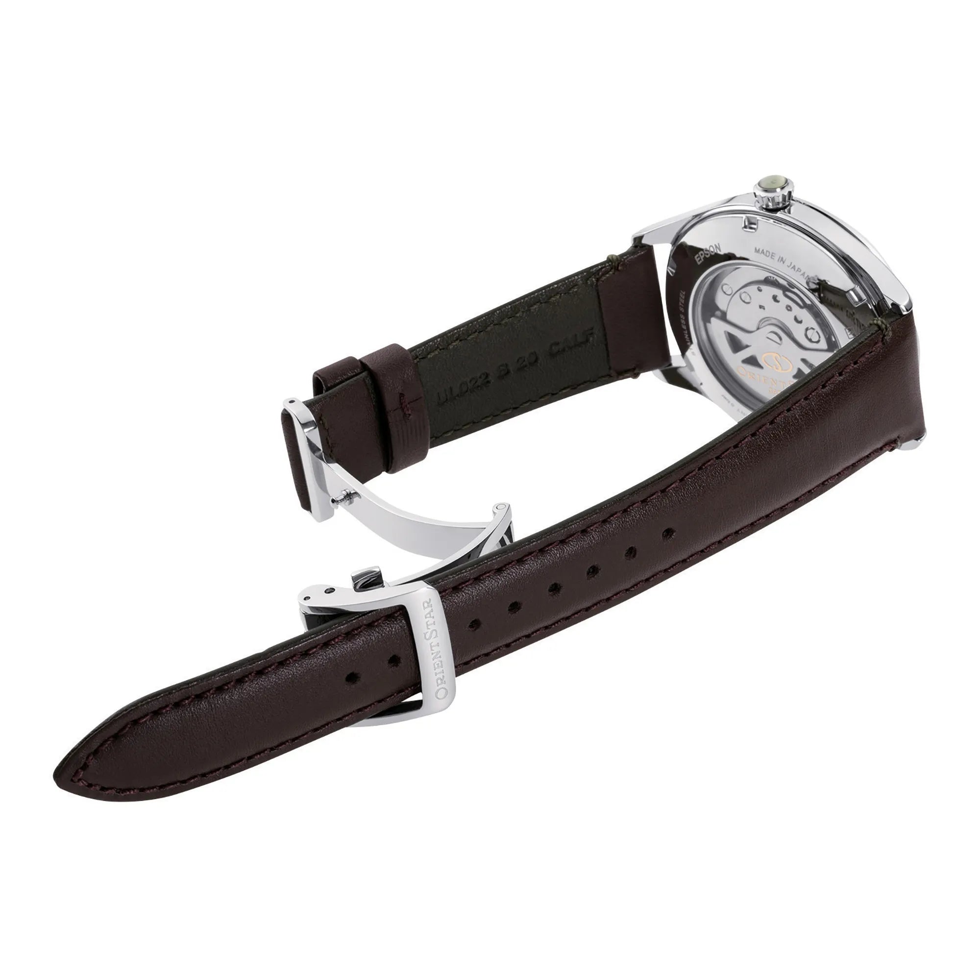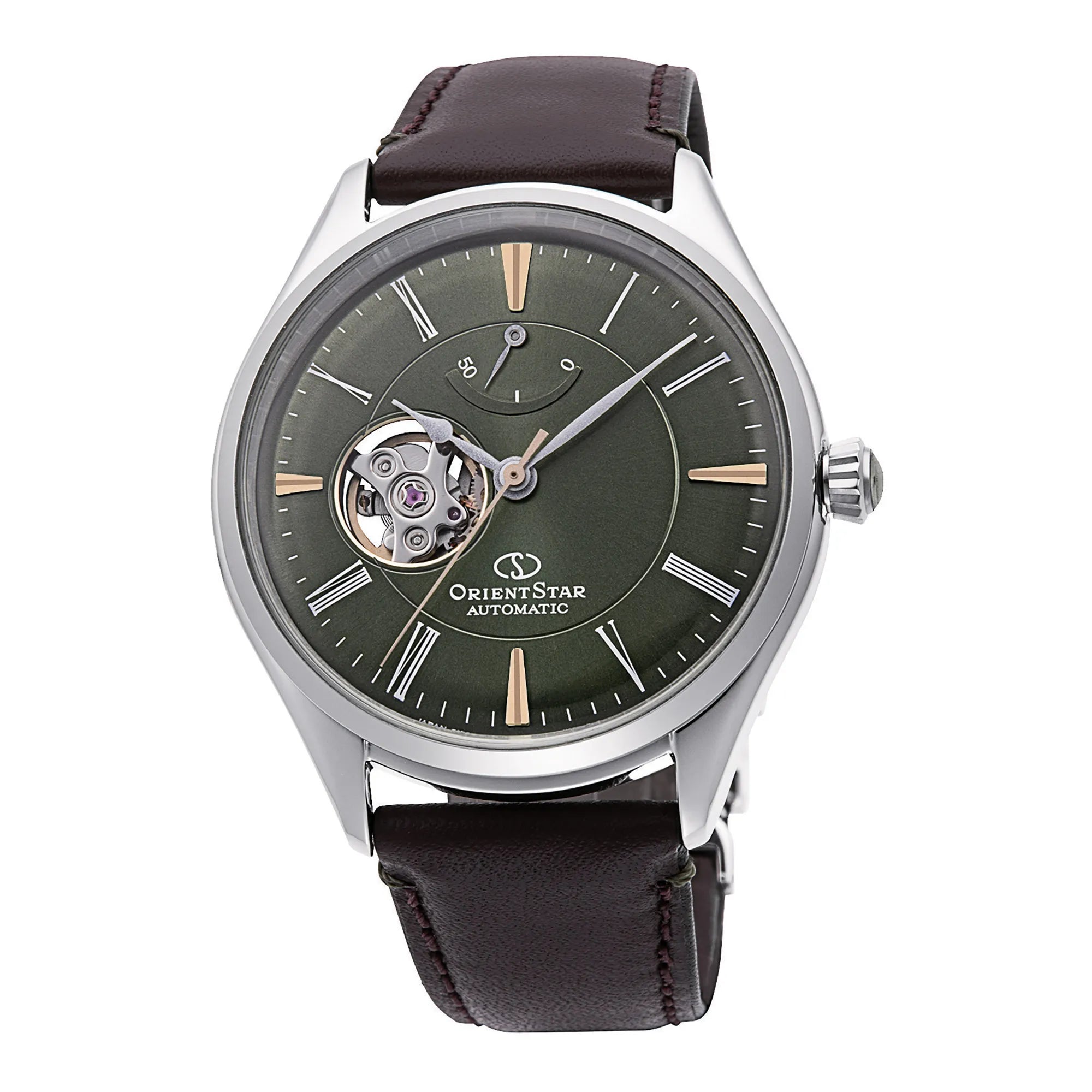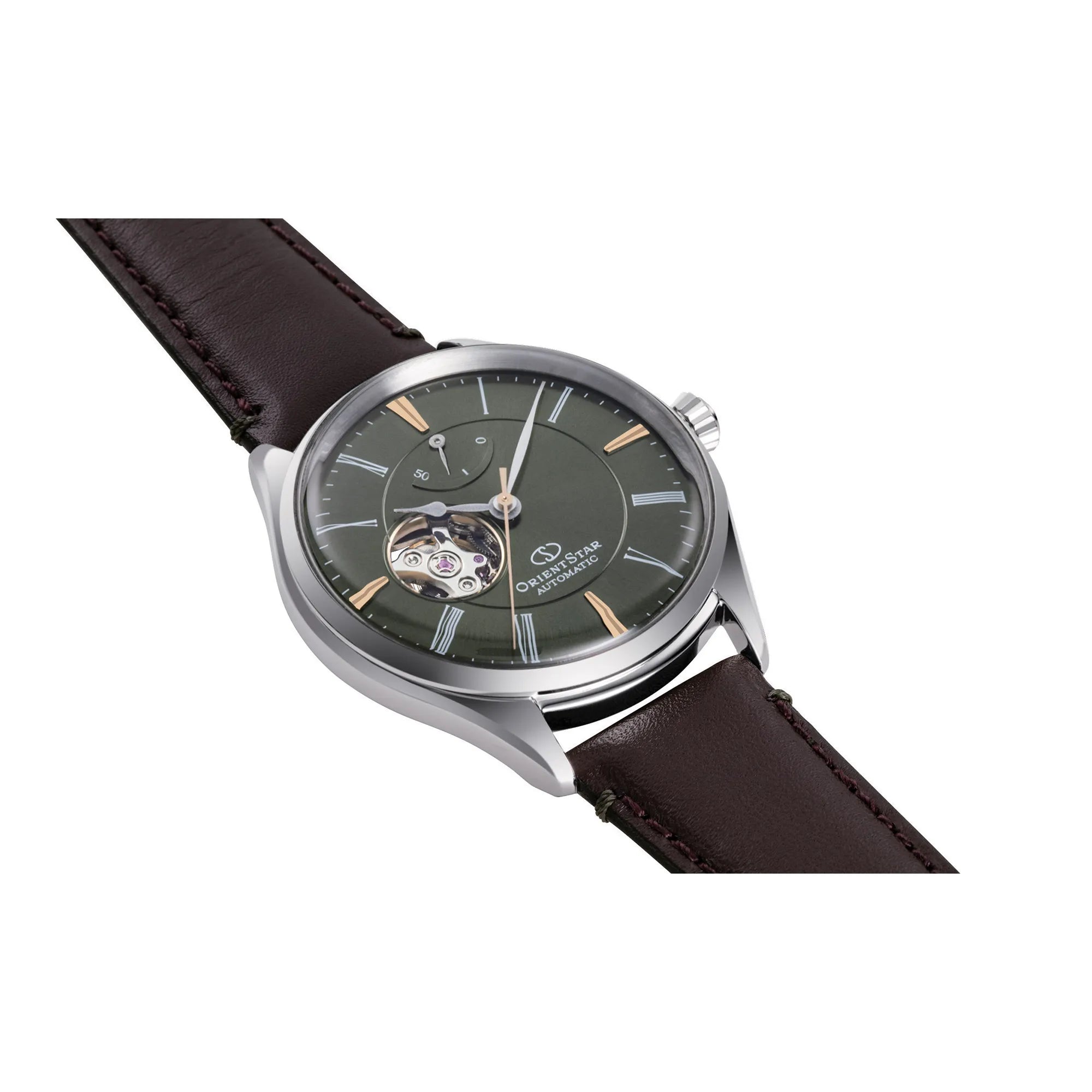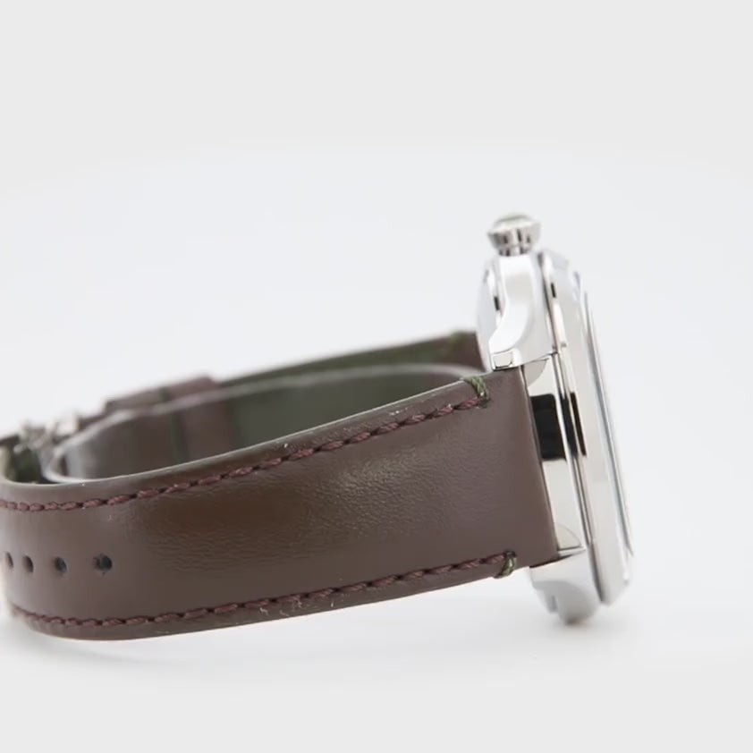 Ein neues Design mit frischem und modernem Aussehen für die Serie Semi Skeleton Netto von ORIENT STAR – gewölbte Zifferblätter in sanften und beruhigenden Farbtönen, inspiriert von natürlichen Farben. Ideal, auch dank ihres wettbewerbsfähigen Preises, als erste mechanische Uhr für eine junge Frau oder einen jungen Mann, mit der Möglichkeit, sie als Paar harmonisch zu kombinieren. Die Öffnung bei 9 Uhr ermöglicht einen Blick auf das hohe Maß an Raffinesse mechanischer Uhren. Der Stein, der die Krone ziert, verleiht einen Hauch von Eleganz, ebenso wie das gewölbte Glas, die französischen Nähte des Armbands und die spitz zulaufenden Zeiger. Hier in Herrenversion mit Gangreserveanzeige, Schokoladenarmband und olivgrünem Zifferblatt.