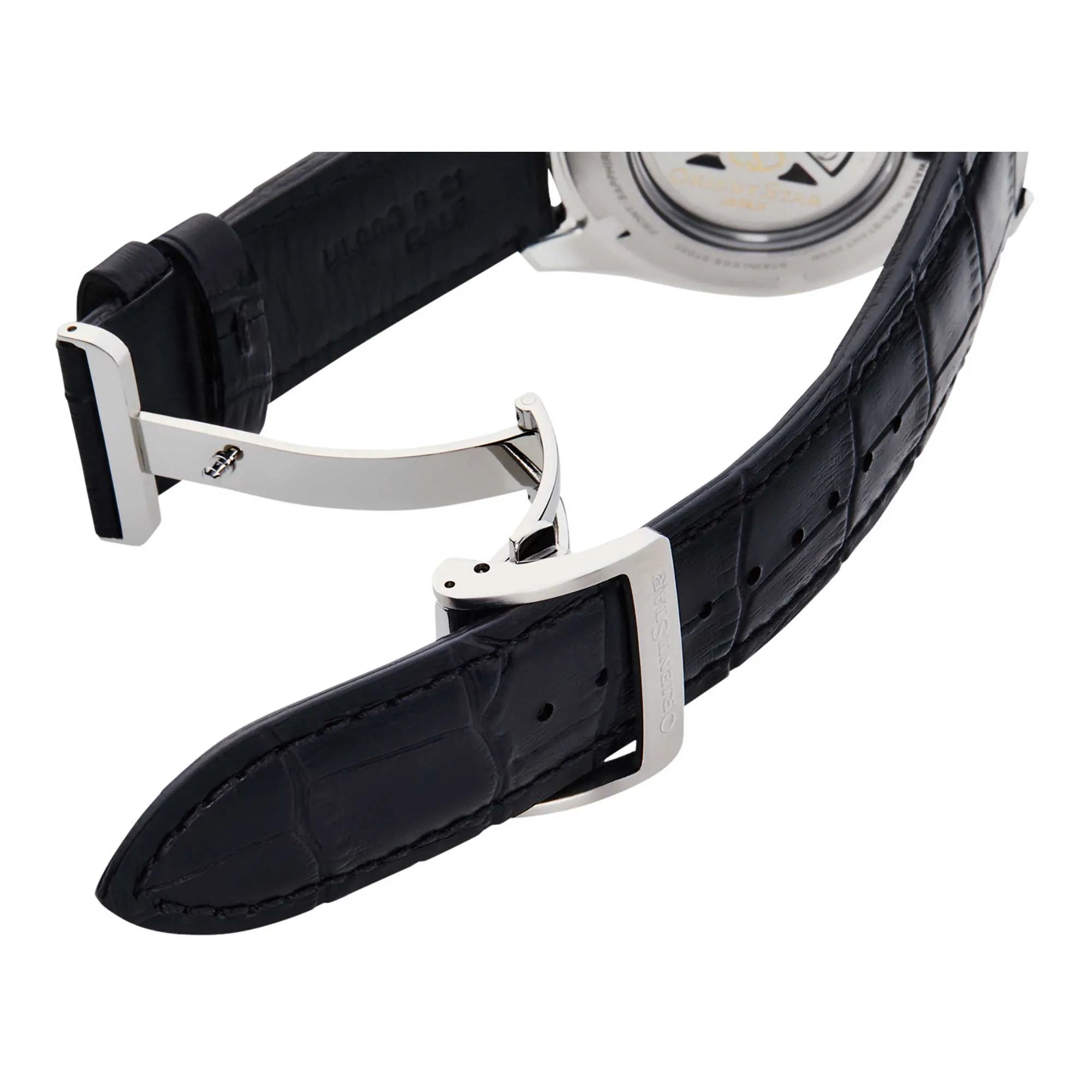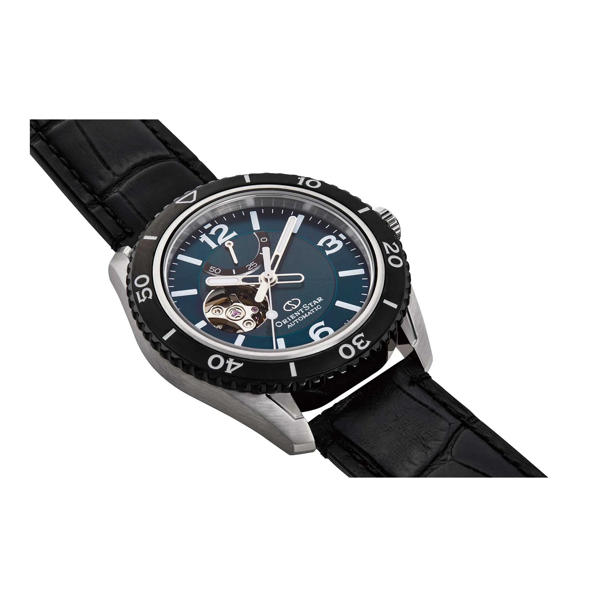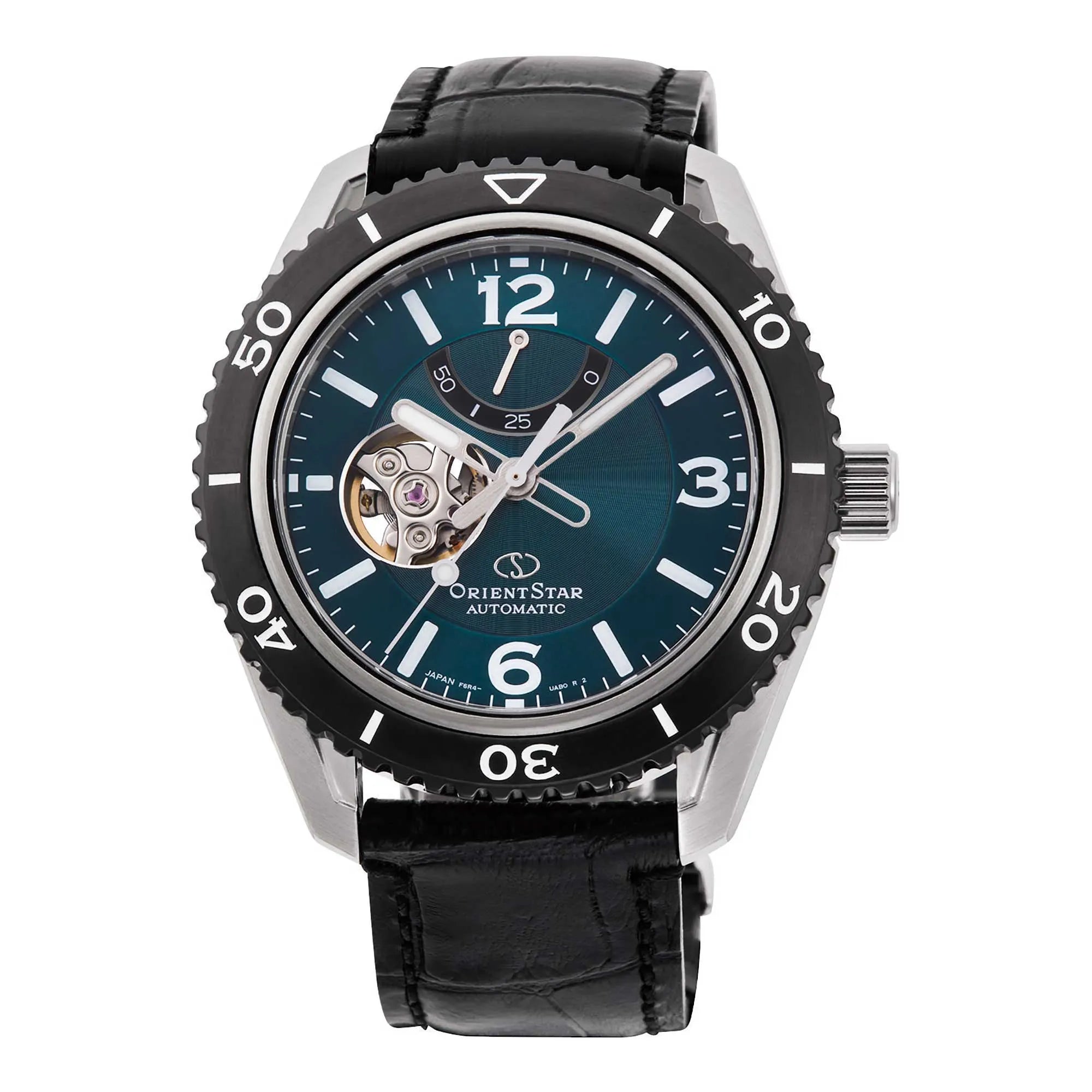 Diese ORIENT STAR Sport Semi Skeleton Open Heart Uhr verkörpert einen sportlichen und modernen Geist. Ausgestattet mit dem berühmten Open Heart, das die Geheimnisse ihres unschätzbaren Uhrwerks offenbart, verfügt dieses Modell zudem über eine Gangreserveanzeige, entspiegeltes Saphirglas, einen verschraubten Gehäuseboden und ein charaktervolles Zifferblatt mit arabischen Ziffern bei 6 und 12 Uhr sowie lanzenförmigen Zeigern. Hier in der Ausführung mit Lederband und tannengrünem Zifferblatt.