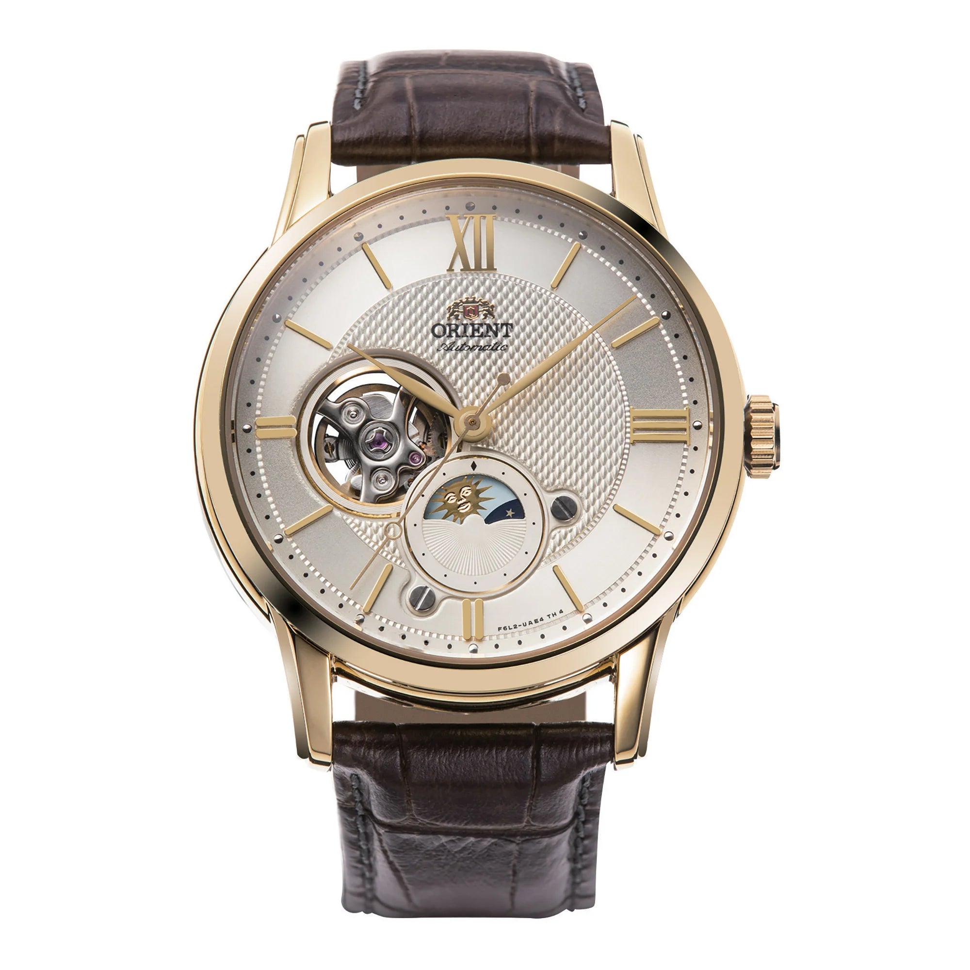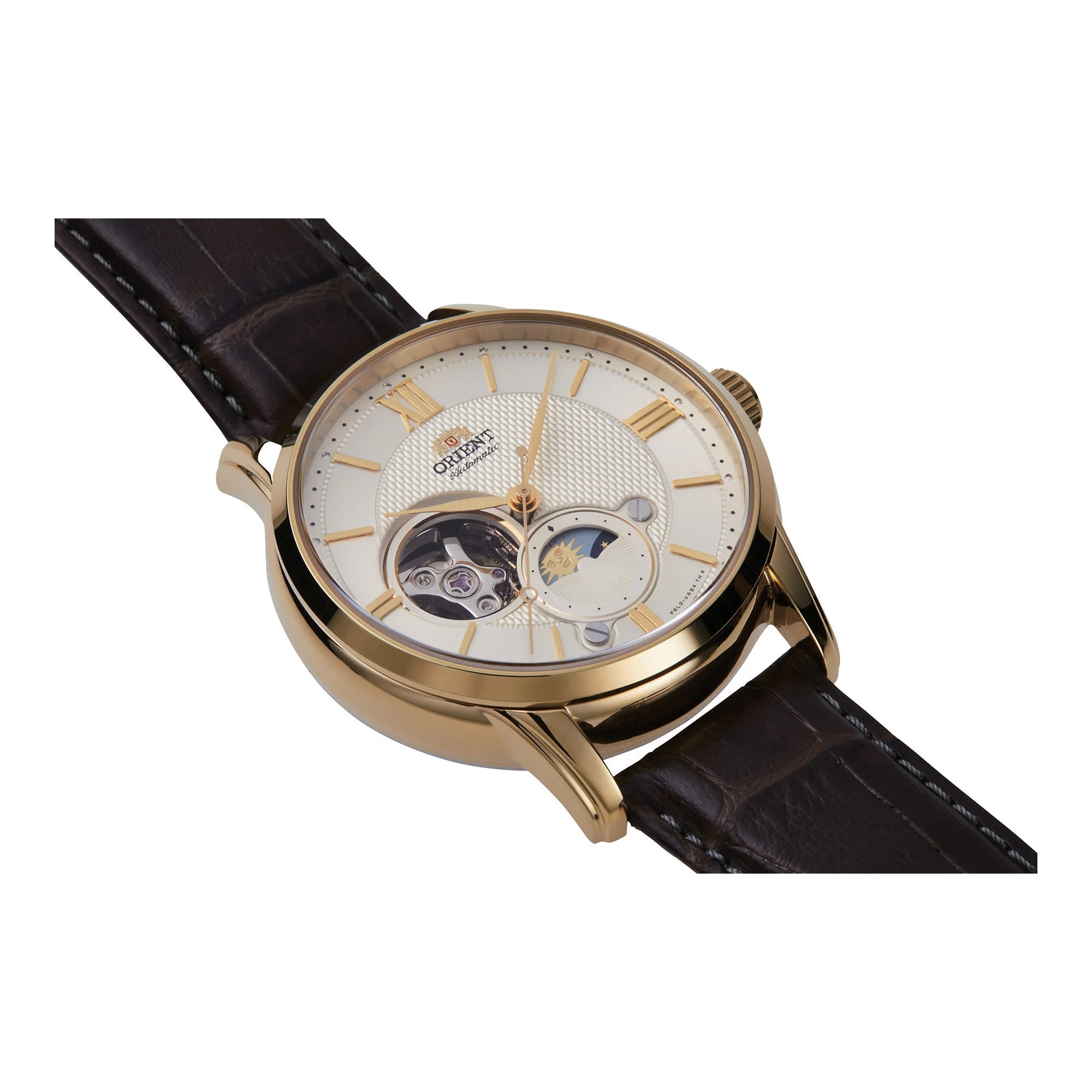 Wunderbare Neuheit in der ORIENT Classic-Familie mit einem schlanken Gehäuse, gewölbtem Glas und einem warmen Vintage-Stil, der einfach und charaktervoll ist. Diese elegante Uhr Sun & Moon zeigt neben dem bekannten, bei Liebhabern beliebten Halbskelett ein rotierendes Scheibchen, das über 24 Stunden den Übergang von Tag zu Nacht anzeigt.