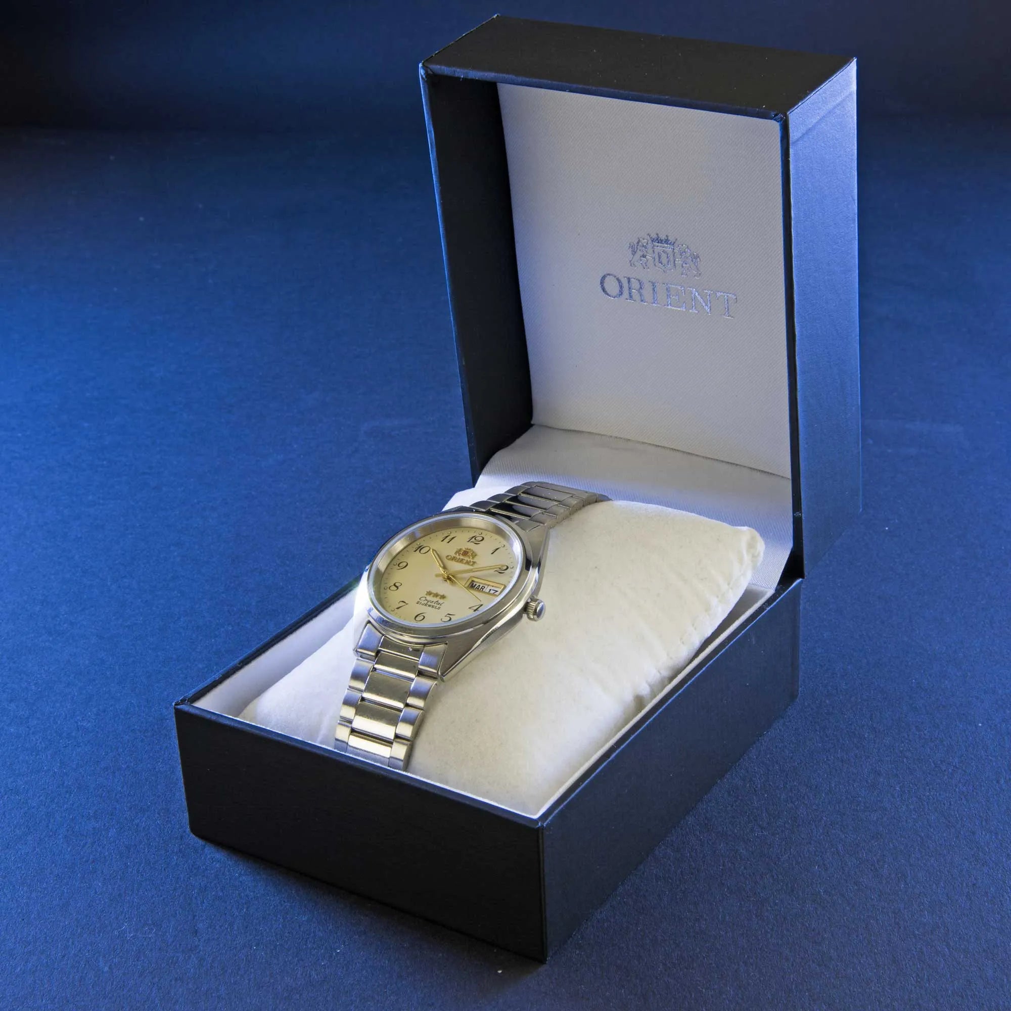 Entdecken Sie die legendäre 3 Star Kollektion von ORIENT, ein Symbol für Zuverlässigkeit und Stil, das Generationen überdauert und seine Identität bewahrt hat. Jedes Modell dieser Linie verkörpert die Philosophie der Marke, die auf Genauigkeit, Langlebigkeit und Detailpflege ausgerichtet ist. Eine Uhr, die klassische Ästhetik mit soliden Leistungen verbindet und sich ideal eignet, um jeden Moment des Tages zu begleiten. Das runde Gehäuse aus rostfreiem Stahl mit einem Durchmesser von 37 mm und einer Höhe von 11 mm bietet ausgewogene Proportionen und optimalen Tragekomfort am Handgelenk. Das Mineralglas schützt das Zifferblatt, während die Druckkrone eine einfache Einstellung ermöglicht. Die Wasserdichtigkeit bestätigt die Zuverlässigkeit im Alltag und macht sie für verschiedene Situationen geeignet. Das automatische ORIENT Kaliber F4902 mit 21 Rubinsteinen garantiert eine geschätzte Ganggenauigkeit von +25/-15 Sekunden pro Tag und einen gleichmäßigen Lauf. Dieses mechanische Werk wird durch die natürliche Bewegung des Handgelenks aufgezogen, wodurch Batterien überflüssig sind. Das Zifferblatt mit Drei-Zeiger-Anzeige integriert einen Doppelkalendar mit Tages- und Datumsanzeige, ein praktisches und funktionales Detail, das den Alltagsnutzen erhöht. Die Ablesbarkeit ist auch bei schlechten Lichtverhältnissen dank der mit Leuchtmasse behandelten Indizes und Zeiger gewährleistet. Das 19 mm breite Stahlarmband, geeignet für Handgelenke bis 19 cm Umfang, ist mit einer klappbaren Faltschließe ausgestattet, die Stabilität und Komfort sichert. Mit seinem schlichten und zeitlosen Design passt das Modell 3 Star auf natürliche Weise zu sowohl formellen als auch legeren Stilen und bewahrt stets einen Hauch von wesentlicher Eleganz. Eine automatische Uhr für jene, die Wert auf handwerkliche Qualität und die Tradition von ORIENT legen, die Funktionalität und Vintage-Charme vereint. Ein zuverlässiger und zeitloser Zeitmesser, perfekt für alle, die einen langlebigen Begleiter mit authentischem Stil suchen.