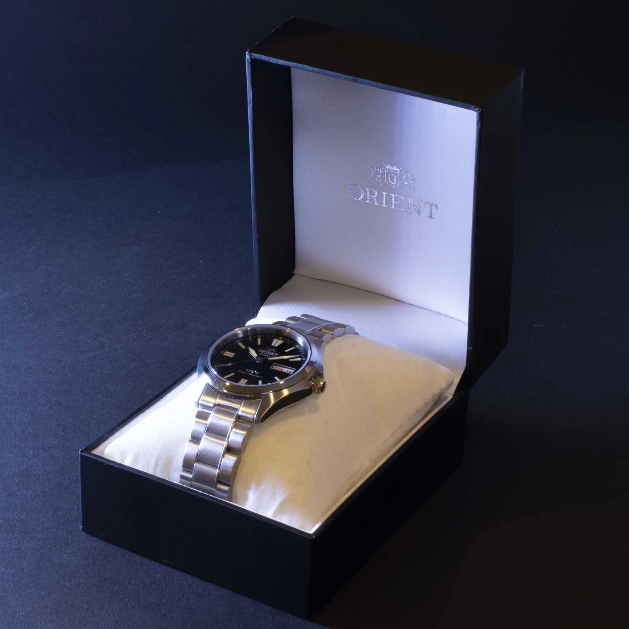 Entdecken Sie die legendäre 3 Star Kollektion von ORIENT, ein Symbol für Zuverlässigkeit und Stil, das Generationen überdauert und seine Identität bewahrt hat. Jedes Modell dieser Linie verkörpert die Philosophie der Marke, die auf Genauigkeit, Langlebigkeit und Detailpflege ausgerichtet ist. Eine Uhr, die klassische Ästhetik mit soliden Leistungen verbindet und sich ideal eignet, um jeden Moment des Tages zu begleiten. Das runde Gehäuse aus rostfreiem Stahl mit einem Durchmesser von 37 mm und einer Höhe von 11 mm bietet ausgewogene Proportionen und optimalen Tragekomfort am Handgelenk. Das Mineralglas schützt das Zifferblatt, während die Druckkrone eine einfache Einstellung ermöglicht. Die Wasserdichtigkeit bestätigt die Zuverlässigkeit im Alltag und macht sie für verschiedene Situationen geeignet. Das automatische ORIENT Kaliber F4902 mit 21 Rubinsteinen garantiert eine geschätzte Ganggenauigkeit von +25/-15 Sekunden pro Tag und einen gleichmäßigen Lauf. Dieses mechanische Werk wird durch die natürliche Bewegung des Handgelenks aufgezogen, wodurch Batterien überflüssig sind. Das Zifferblatt mit Drei-Zeiger-Anzeige integriert einen Doppelkalendar mit Tages- und Datumsanzeige, ein praktisches und funktionales Detail, das den Alltagsnutzen erhöht. Die Ablesbarkeit ist auch bei schlechten Lichtverhältnissen dank der mit Leuchtmasse behandelten Indizes und Zeiger gewährleistet. Das 19 mm breite Stahlarmband, geeignet für Handgelenke bis 19 cm Umfang, ist mit einer klappbaren Faltschließe ausgestattet, die Stabilität und Komfort sichert. Mit seinem schlichten und zeitlosen Design passt das Modell 3 Star auf natürliche Weise zu sowohl formellen als auch legeren Stilen und bewahrt stets einen Hauch von wesentlicher Eleganz. Eine automatische Uhr für jene, die Wert auf handwerkliche Qualität und die Tradition von ORIENT legen, die Funktionalität und Vintage-Charme vereint. Ein zuverlässiger und zeitloser Zeitmesser, perfekt für alle, die einen langlebigen Begleiter mit authentischem Stil suchen.